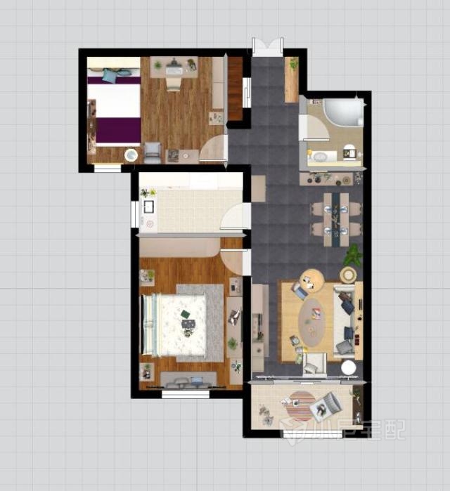 深灰色的地砖搭配暖黄色的地毯,显得十分温馨。定制的电视柜组合增加了储物功能。