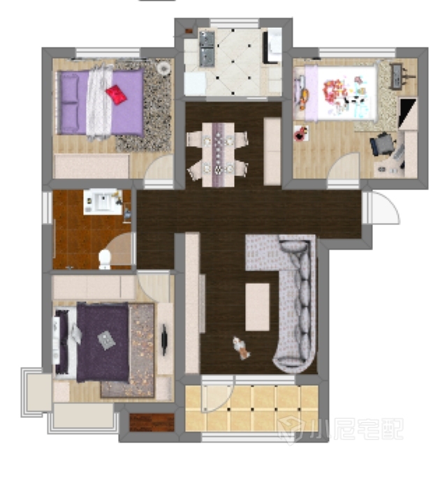 整个卧室比较温馨,紫色床和窗帘彰显出一种清新淡雅的气氛,更有家的感觉。
