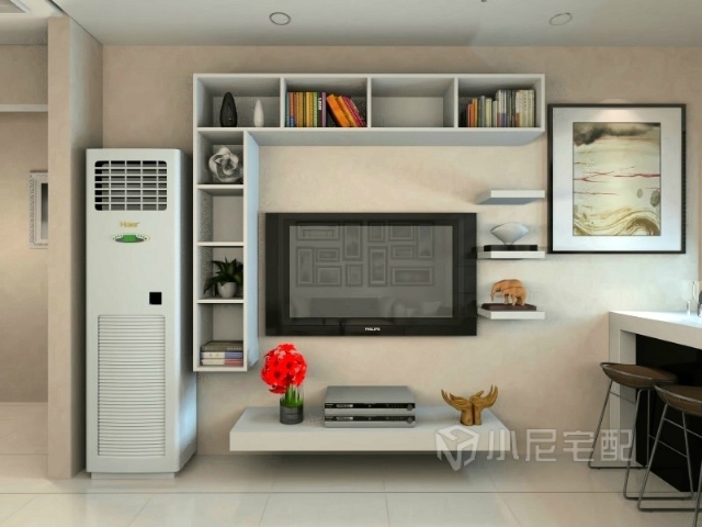 电视墙使用柜子,客厅虽小但储物空间足够,格架和板架可放置不同物品,同时避免造型过于单一。