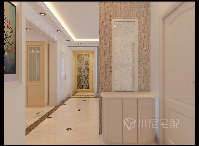 过道走廊明亮节俭,走廊尽头以图案马赛克收尾,彰显主人的审美感