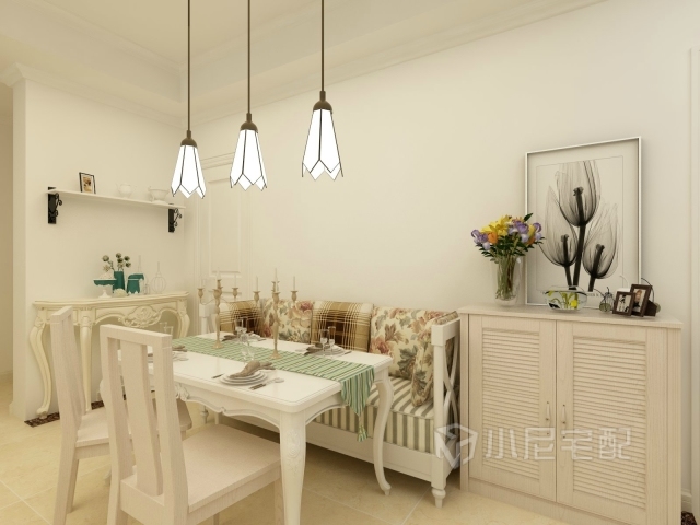 将鸢尾花一般的逸静恬淡运用到空间的装饰中,创造优美自然,简洁大方的田园风格,显得整个空间明亮清爽,温馨浪漫。
