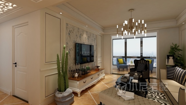 米色的电视背景墙造型搭配素雅的蓝花壁纸,现代感的吊灯,映着远处落地窗外的城市风景,简约大气。