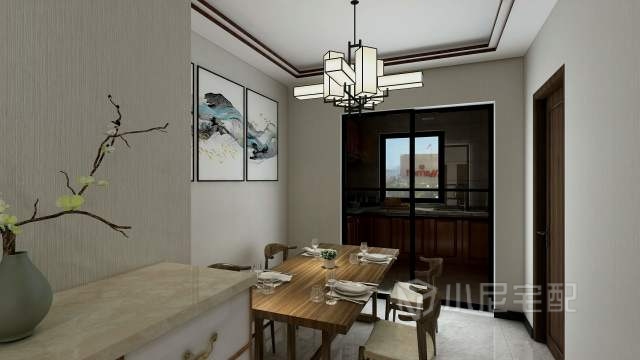 餐厅的吊顶简单、吊灯复杂,一简一繁搭配木纹餐桌,古朴中带有现代,不会让主人感觉压抑。